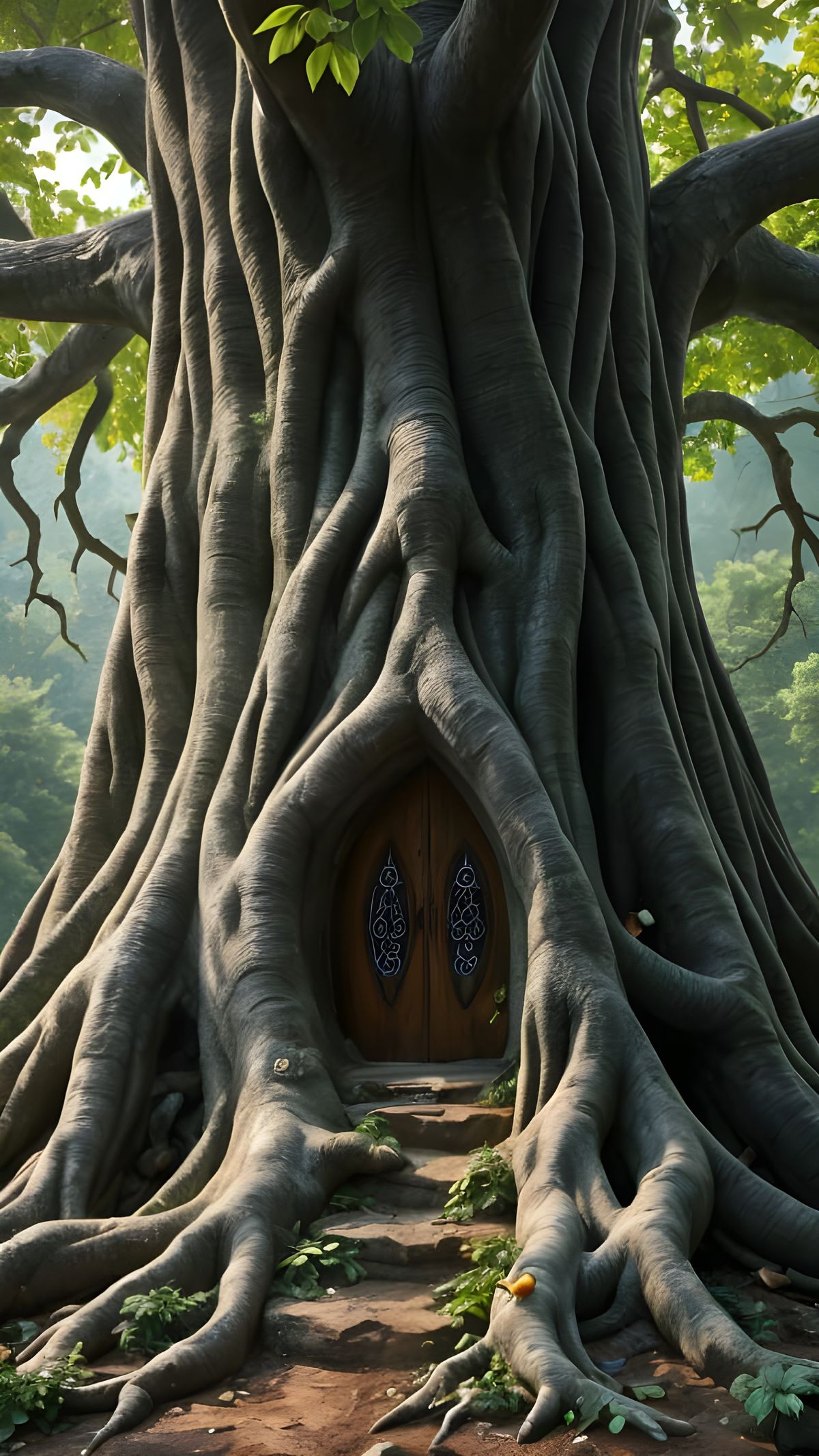 A striking picture of a colossal, ancient tree with a magical door nestled in its trunk. Fairies and magical creatures surround the tree, which has roots like veins and shimmering leaves.