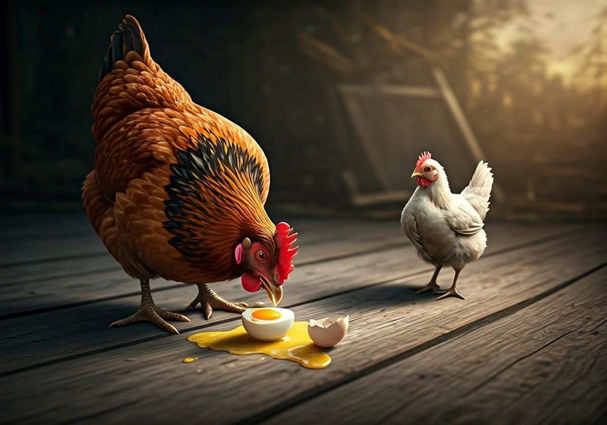 This image depicts a dramatic scene of a plump hen greedily pecking at an egg, while a scrawny chicken looks on in terror. The scene is set in a rustic, rural landscape with warm, earthy tones and hyperrealistic textures.