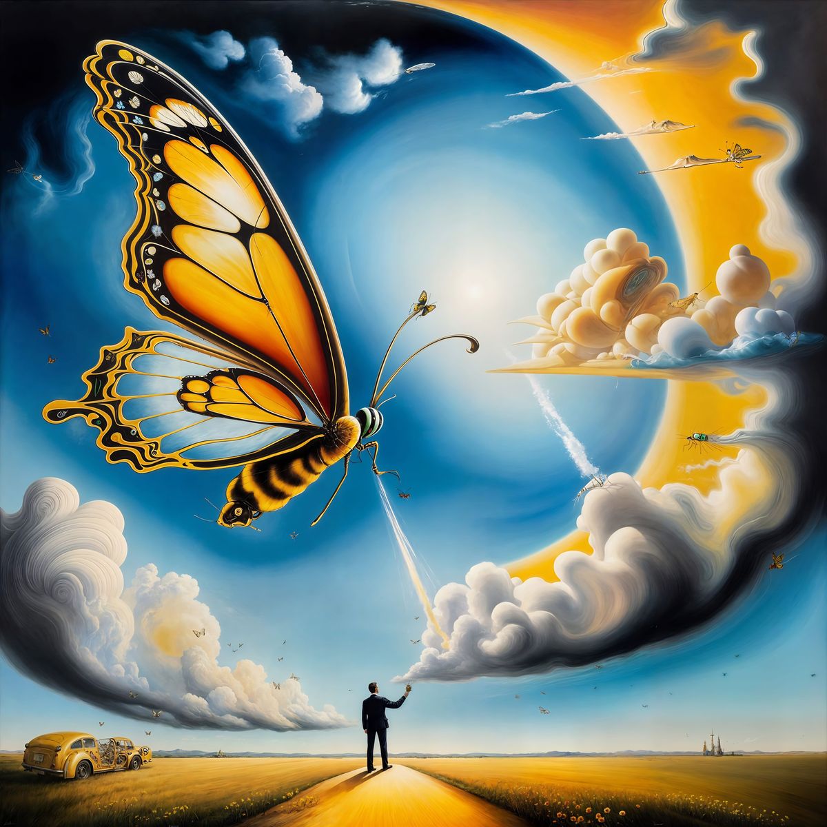 A striking picture of a surrealist scene where a single button press opens a celestial portal, unleashing a swarm of butterflies in a dreamlike atmosphere, reminiscent of Dali's melting oil on canvas style