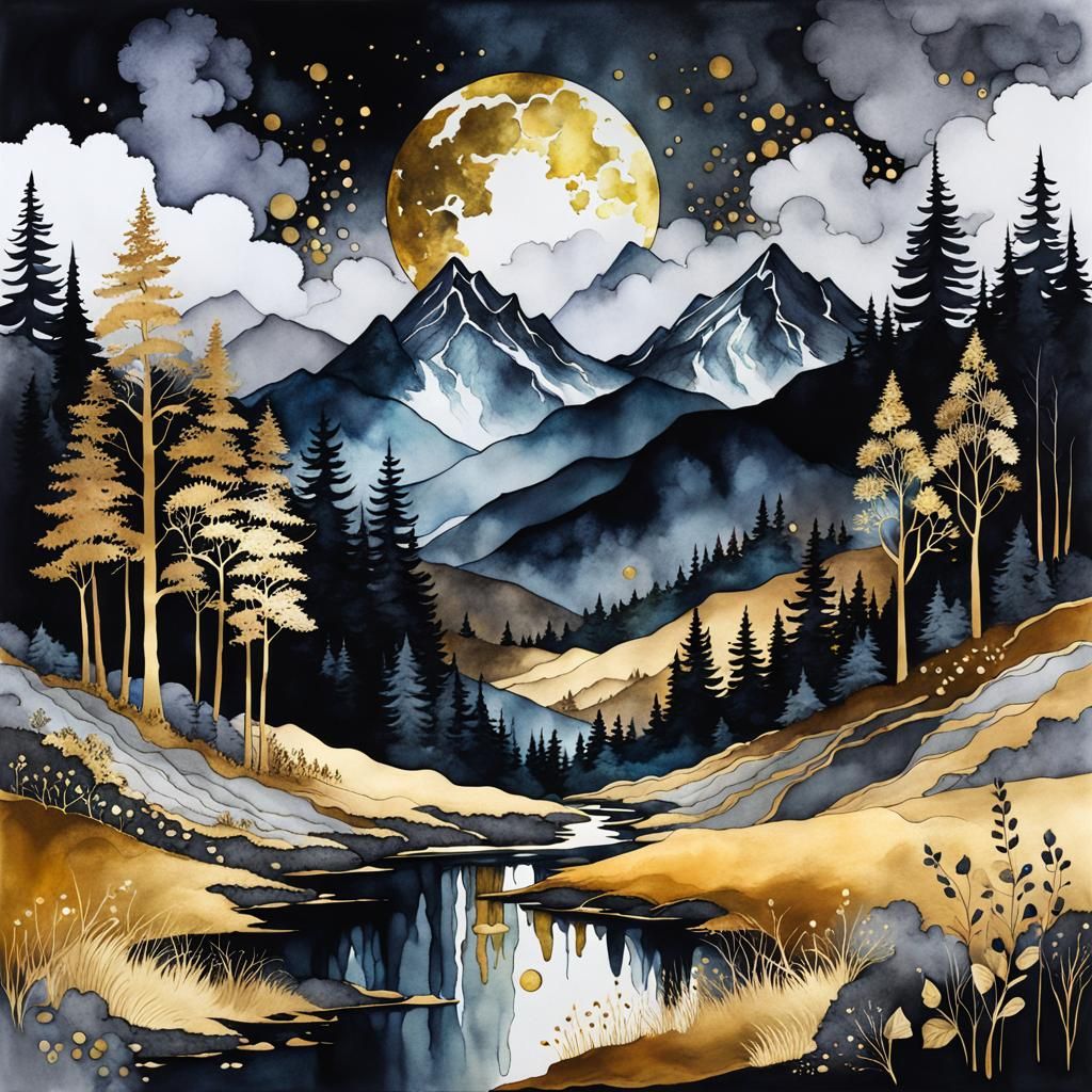 This image shows an alcohol ink fantasy illustration of the Appalachian wilderness. The dark, highly detailed scene features gold foil accents and a flat, storybook aesthetic.
