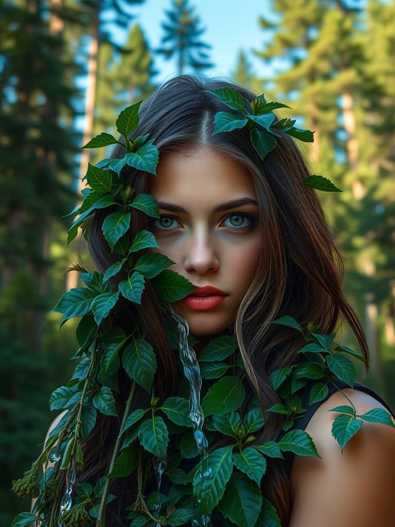 A photorealistic close-up of a young woman whose face is adorned with lush green leaves and vines, with a waterfall gently flowing. The image features soft lighting and a natural color palette.