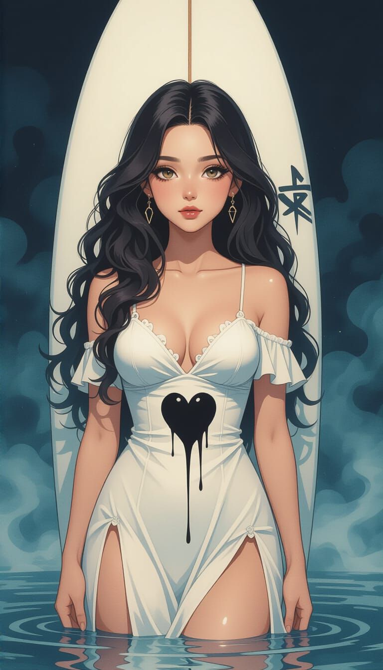 This image shows a young woman with long, dark hair and large, sparkling eyes, posed with a surfboard. She wears a white dress marked with a black heart, set against a misty, smoky backdrop, as 3D rendered digital art.