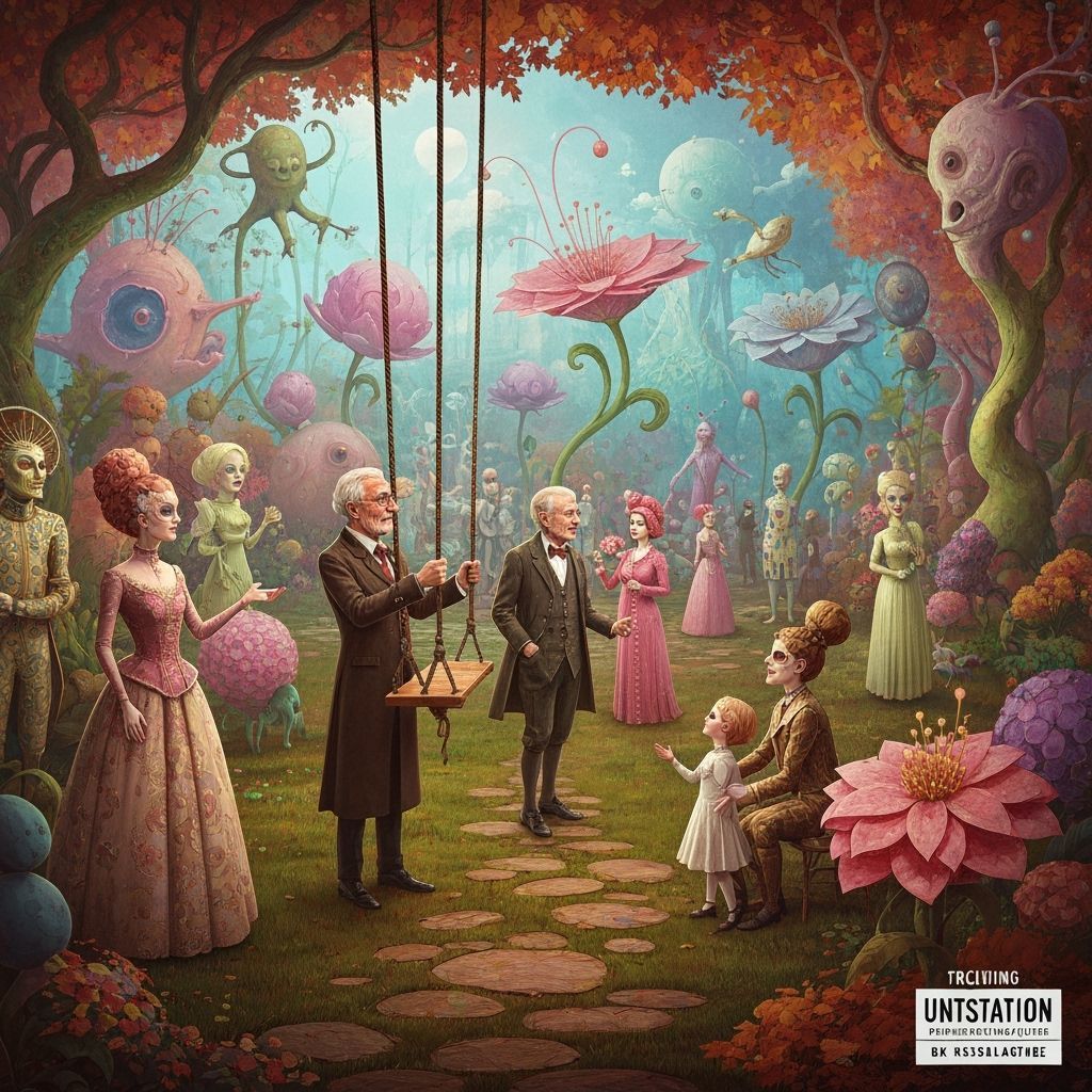 This image shows a grandfather enjoying a swing pushed by his grandchild. The scene is rendered as detailed fantasy concept art with vibrant complementary colors and intricate details, reminiscent of a fantastical splash screen.
