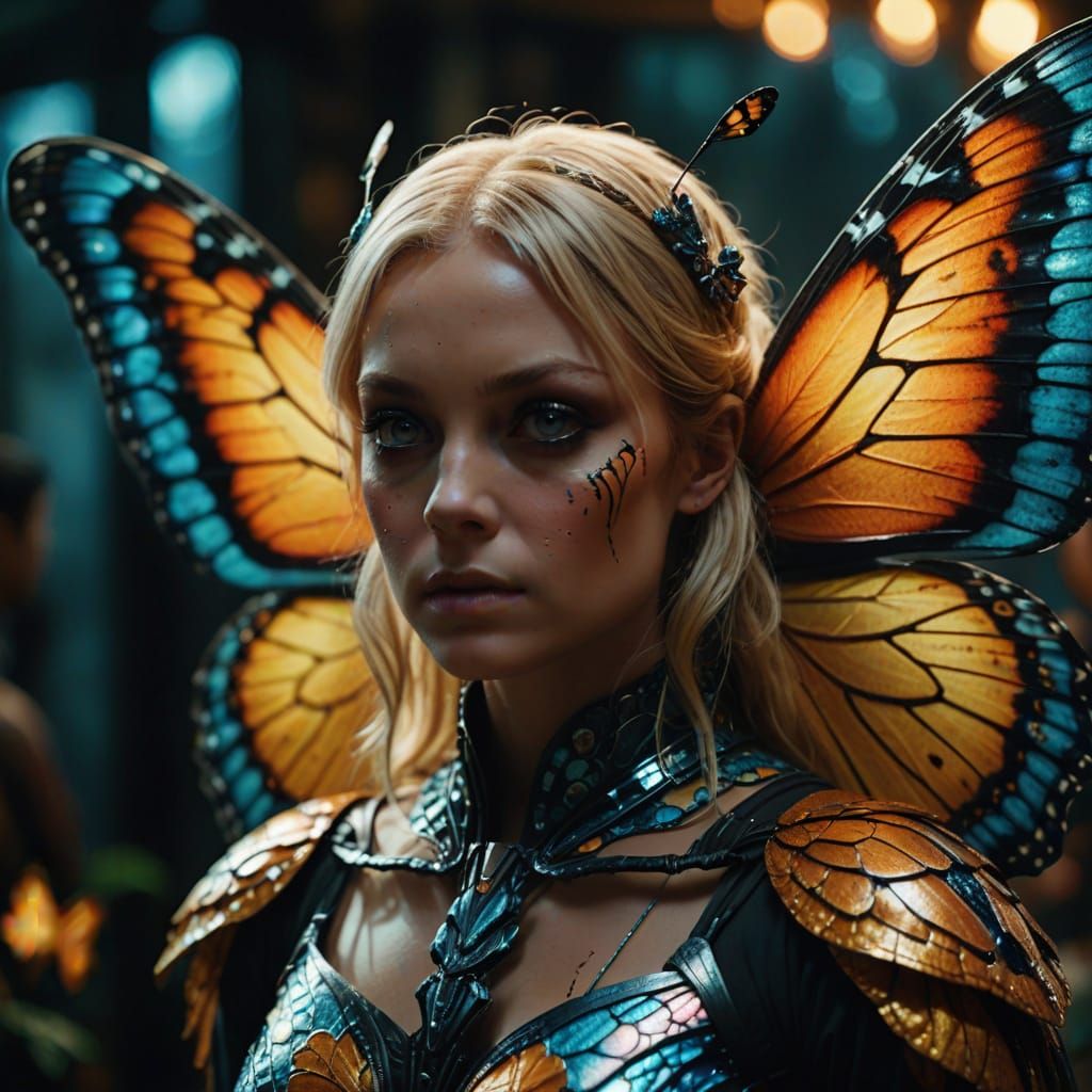 This image shows a close-up of a monstrous humanoid butterfly woman with blonde hair. The figure wears an intricate butterfly costume with iridescent wings, rendered with warm golden tones in a cinematic style.