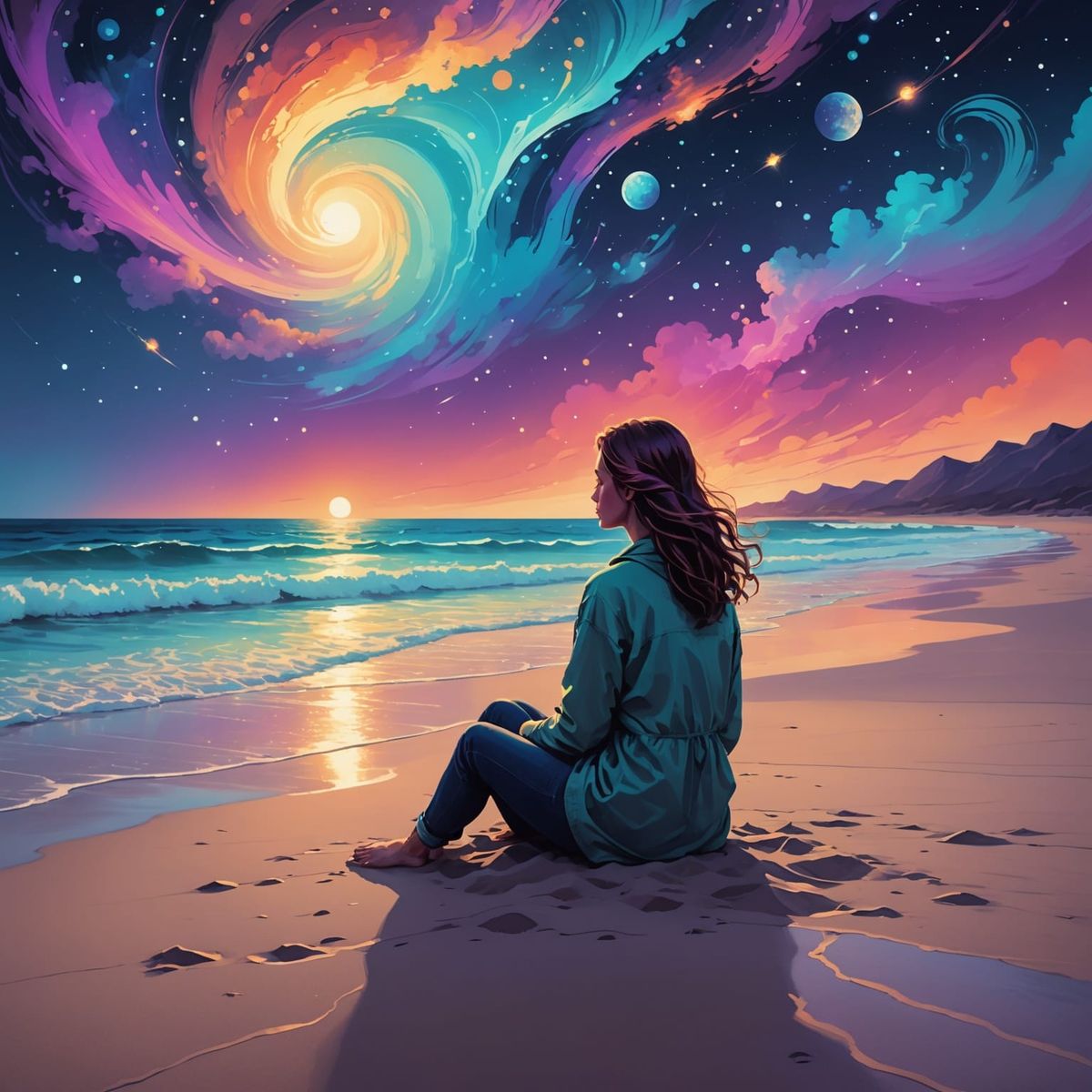 A solitary woman sits on a deserted beach at dusk, gazing at a sky filled with swirling nebulae and distant galaxies. The waves gently lap at the shore, reflecting the cosmic light. The mood is deeply introspective and peaceful, rendered with a surreal, dreamlike quality. This is depicted in a vivid ...