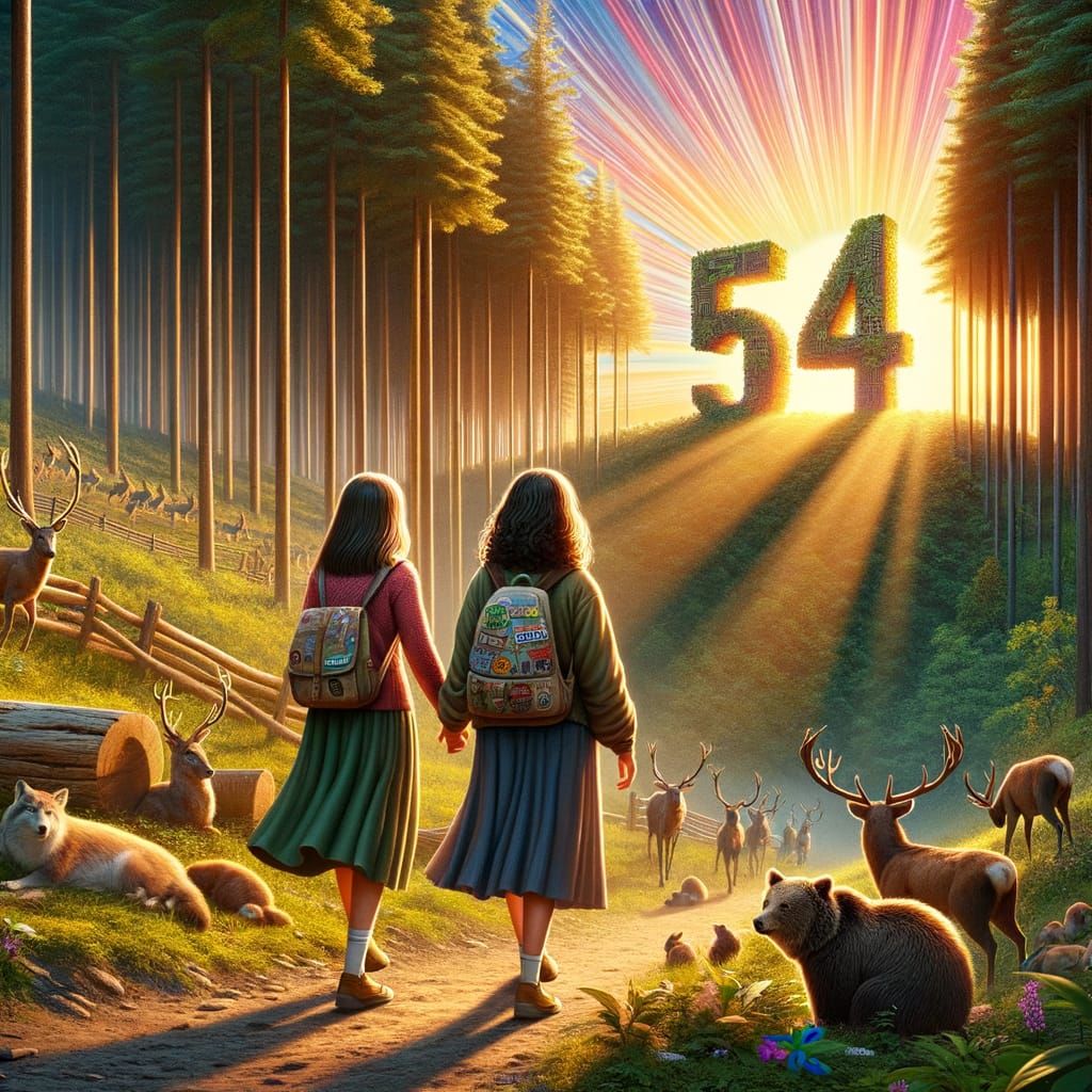 This image shows two sisters from different ethnic backgrounds discovering a strange monument in the forest. Wild animals sleep peacefully nearby as sunbeams turn into colorful letters in the sky. The image is hyperrealistic.
