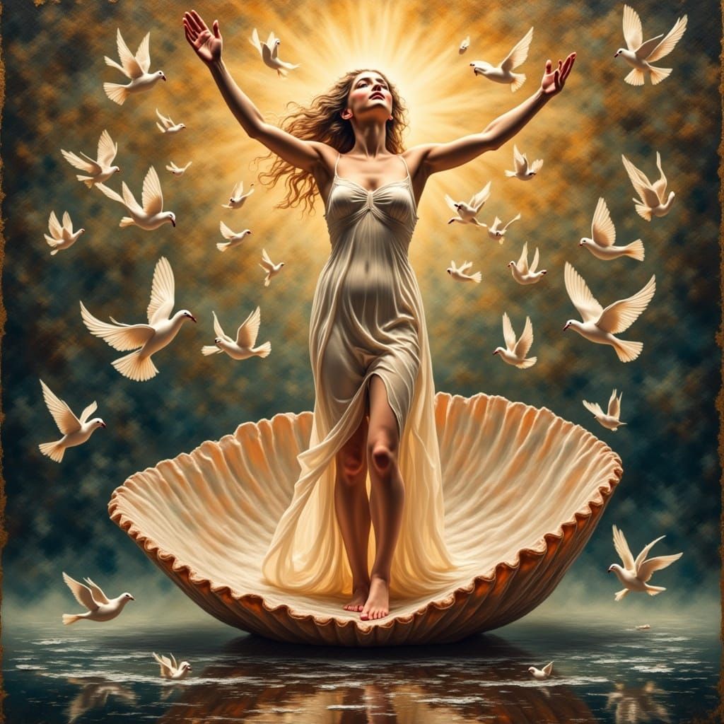 This image depicts a goddess standing triumphantly on a scallop shell, surrounded by cherubs and doves, amidst a radiant aura of golden light, with delicate sea foam caressing her feet. The artwork combines elements of Fauvist and Pre-Raphaelite styles, evoking a dreamlike quality.
