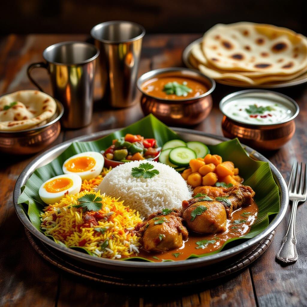 This image shows a colorful South Asian meal served on a banana leaf. The meal includes biryani, spiced chicken, egg, pickles, papadam, raita, curry, and dhal, presented with photorealistic details and warm lighting.