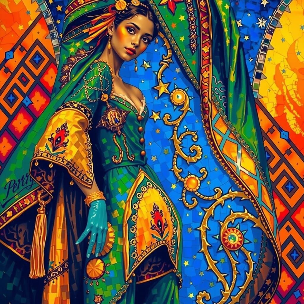 A striking picture of a photorealistic woman depicted in mosaic art. Iridescent colors ripple across her skin against a backdrop of a starry night sky.
