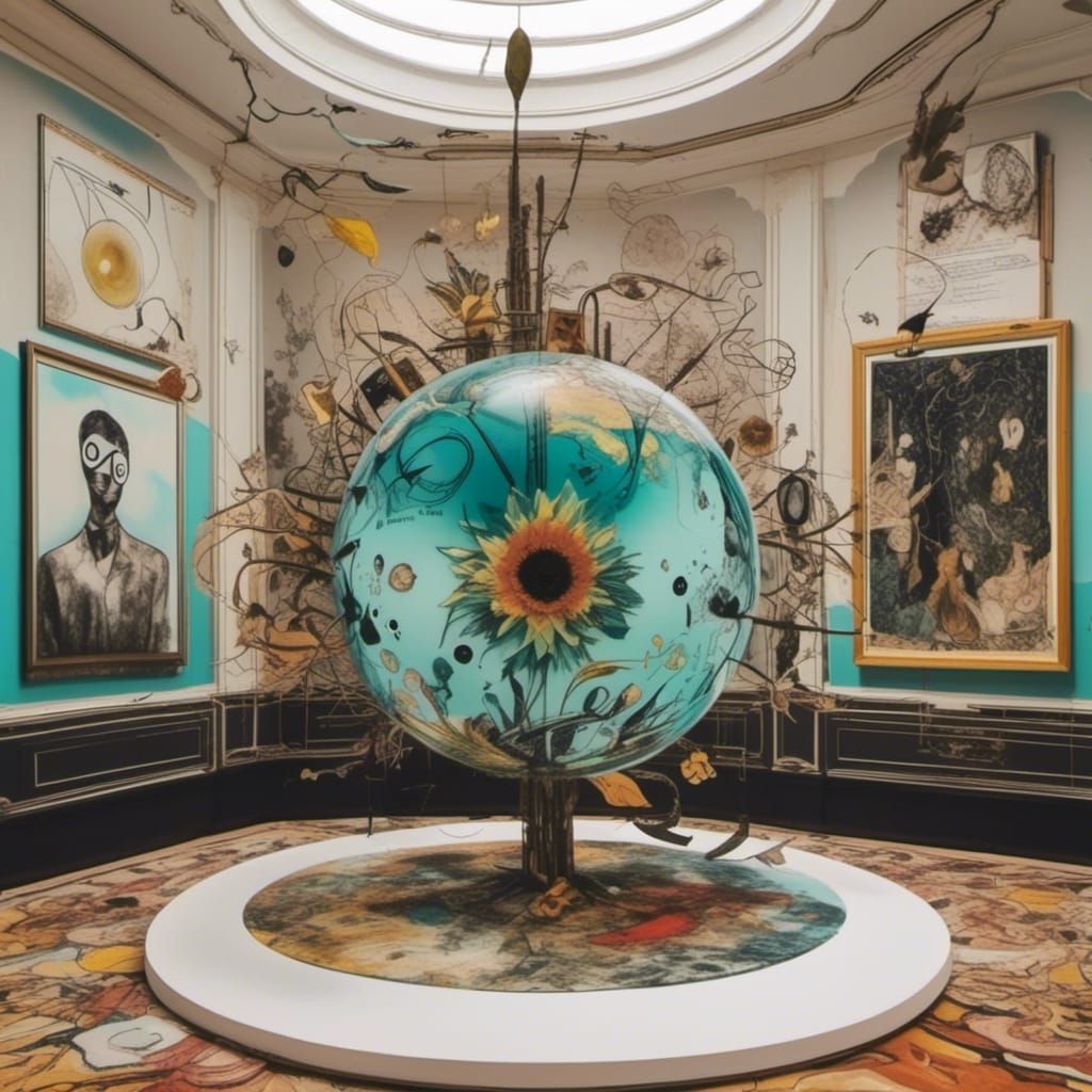 A vibrant mixed-media installation art piece exploring augmented reality. The artwork combines physical elements with digital overlays, creating a dynamic and engaging visual experience.
