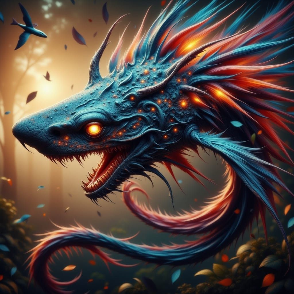 This image depicts a fantastical flying shark in mid-air, its slender body glistening with iridescent blues, reds, and oranges, as it glides effortlessly with its long, fluttery fins, reminiscent of a National Geographic photograph with hyper-realistic details and textures