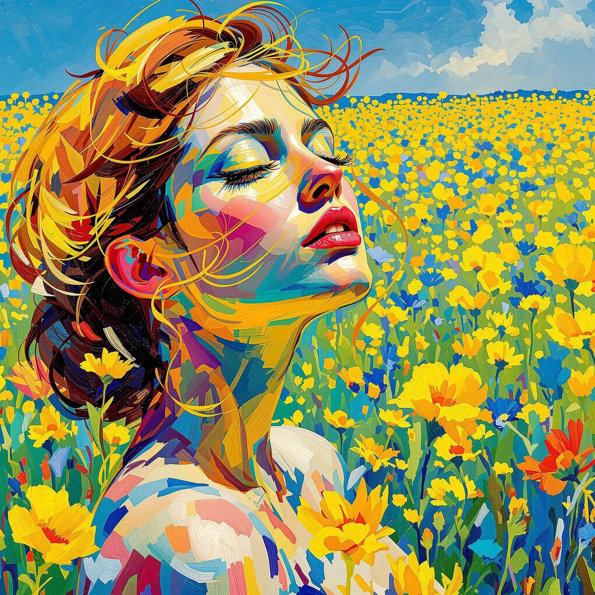 This image depicts a woman with luminous skin in an open blouse, standing in a vibrant wheat field. The artwork features energetic, impressionistic brushstrokes and warm colors.