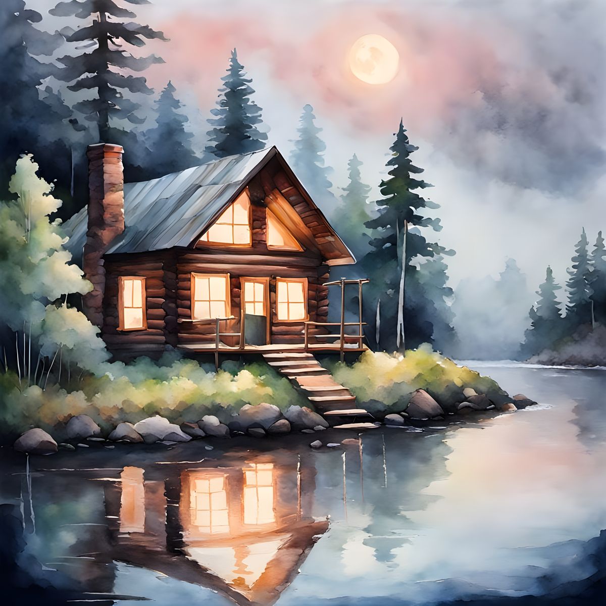 This ethereal watercolor painting shows a log cabin by a tranquil Canadian river under a glowing moonlit sky. Soft textures and atmospheric rendering create a serene, dreamlike mood.