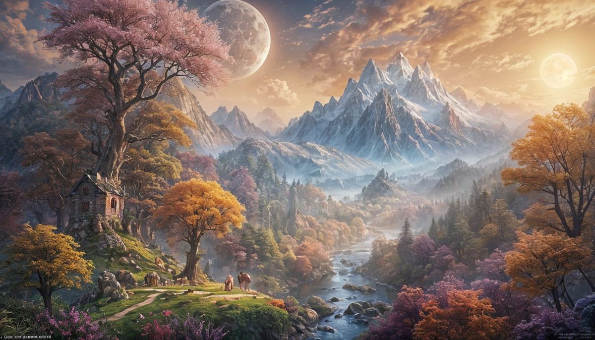 This image shows a surreal, vibrant landscape with mountains and magical creatures under a dual moon and sun. The scene is rendered with soft mist, golden light, and detailed textures in a fantasy art style.