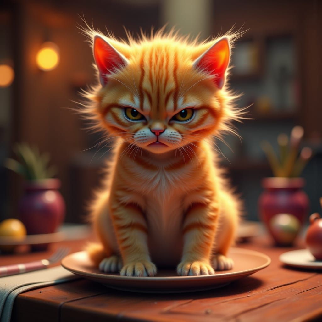 This image shows a highly detailed CGI cartoon of a sulky, adorable, very angry, and hairy kitten. The kitten is sitting on a dinner table in a 3D-rendered style with deep, complementary colors.