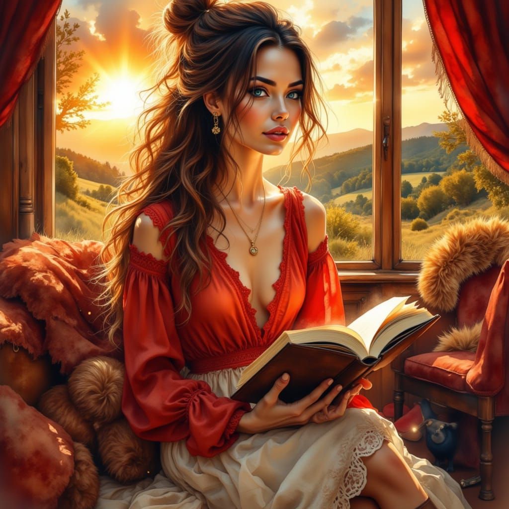 This digital painting captures a woman engrossed in a book, bathed in warm sunset light. She wears a red blouse and white skirt, adorned with gold jewelry, sitting on a velvet sofa. The art style is atmospheric and detailed.