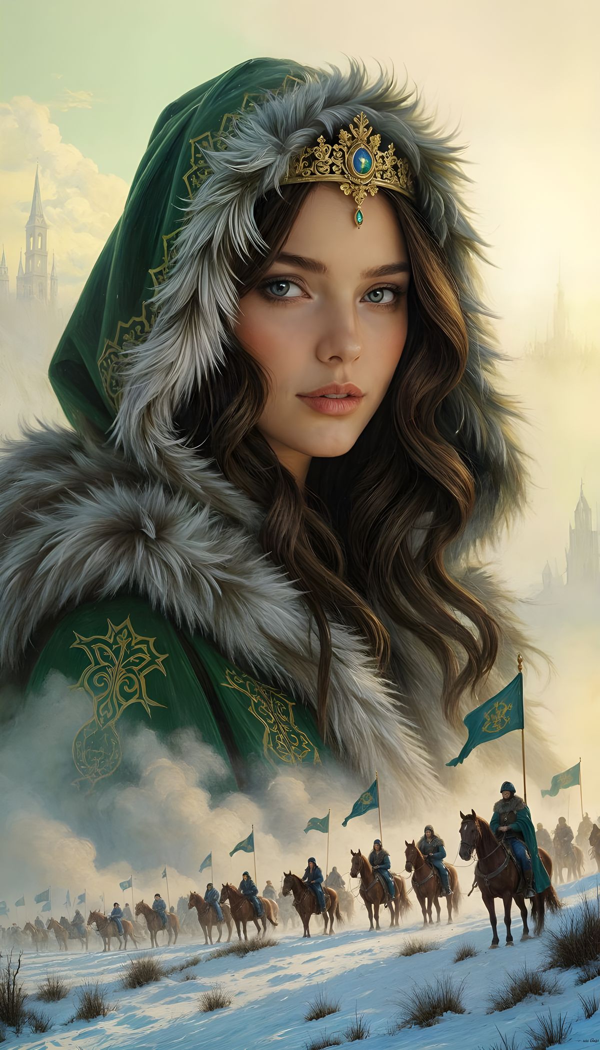 This image shows a young queen with a diadem and fur-trimmed hood. Silhouetted medieval soldiers and horses appear in the foreground of a foggy winter landscape in an oil painting style, with warm, golden lighting.