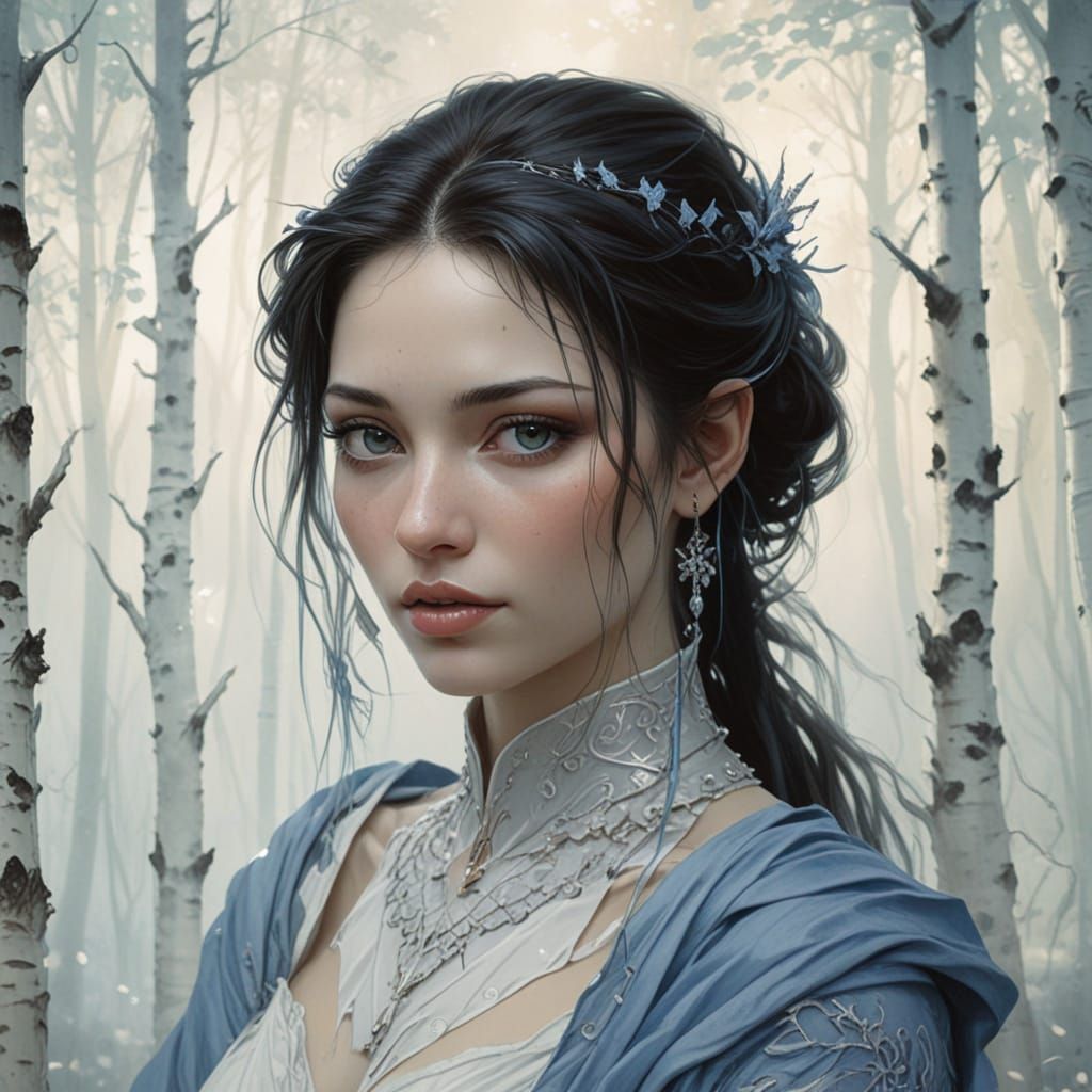 A dreamy, medium shot portrait of a sorceress in a Birch Forest. She wears pale blue silk and white leather, with flowing veils and windblown hair, rendered in an inked watercolor style with loose brushstrokes and warm golden light.