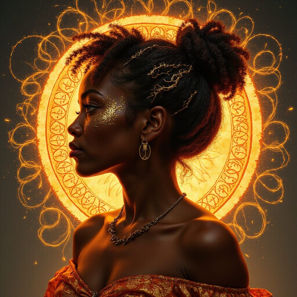 A striking picture of an African American woman with metallic filigree-textured hair. Crackled ember light illuminates her silhouette against swirling runic symbols. This image showcases an ornate Art Nouveau style.