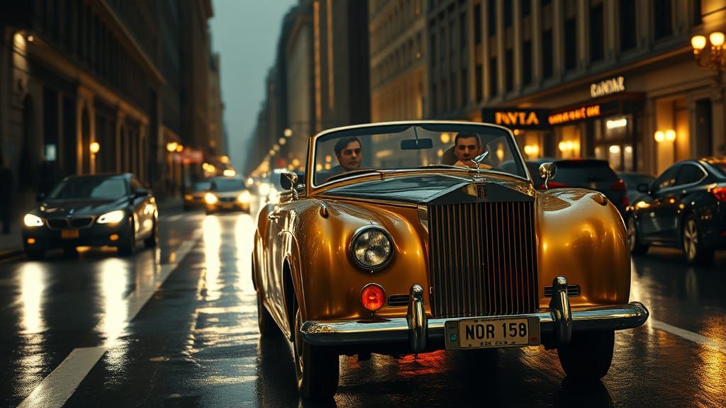This image shows a vintage Rolls-Royce driving on a wet city street at night. The scene is reminiscent of classic Old Hollywood with art deco elements, captured in a cinematic, film noir style.