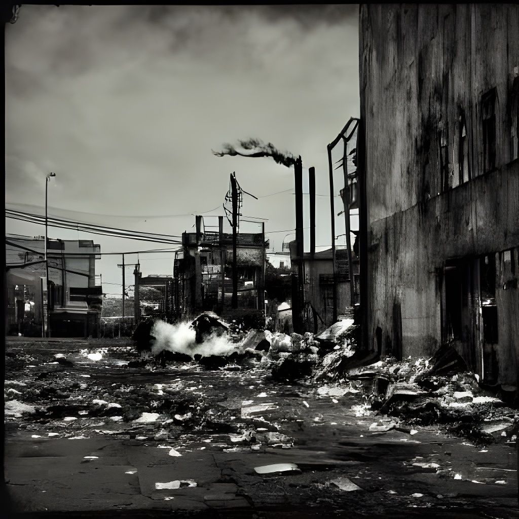 This haunting image captures a desolate cityscape, where giant dogs and insects roam amidst a backdrop of garbage, burning trash, and rusted ruins, evoking a sense of urban decay and mystery.
