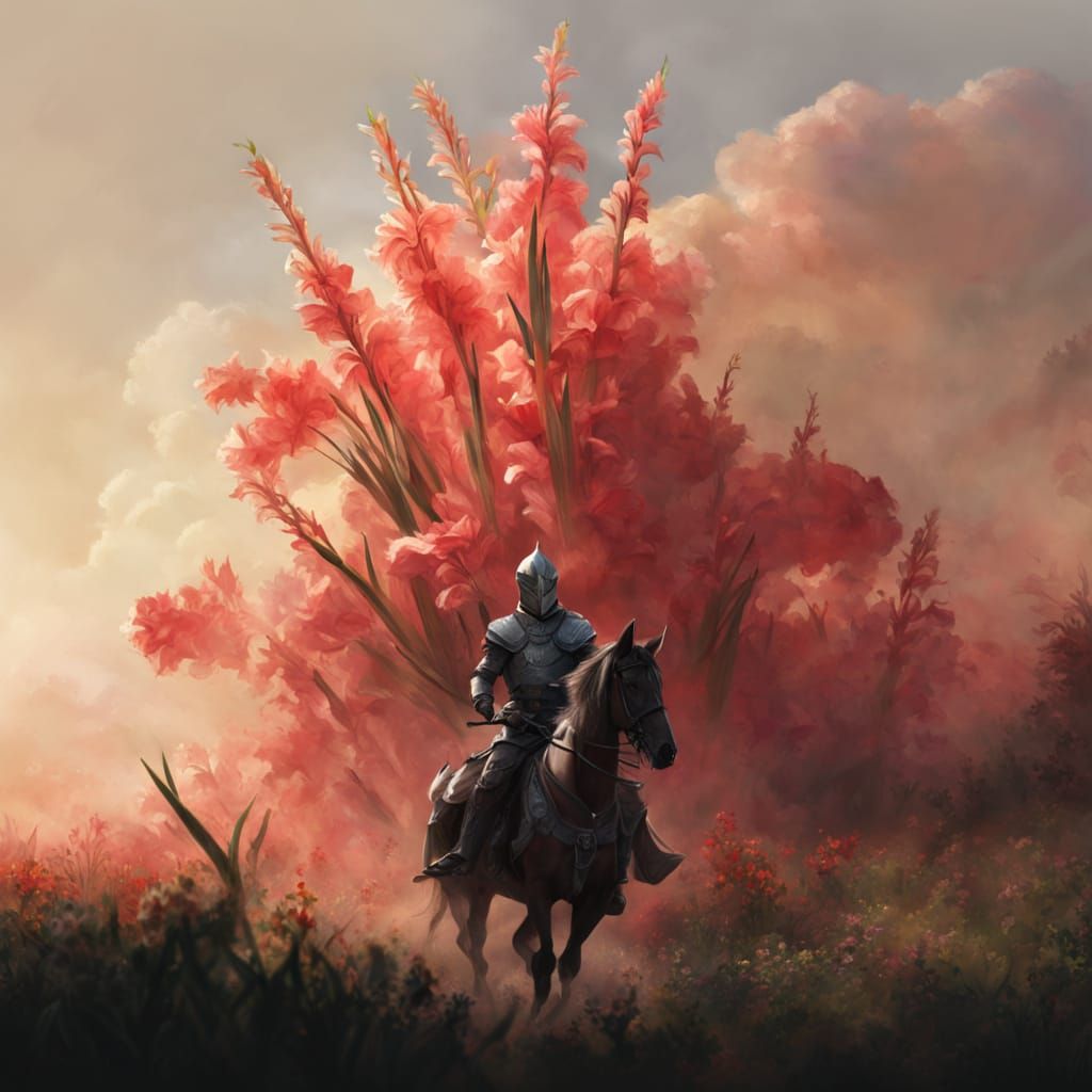 This cinematic digital matte painting shows a knight in ornate armor on horseback charging through a field of gladioli. Features atmospheric fantasy illustration, volumetric fog, and deep color palette.