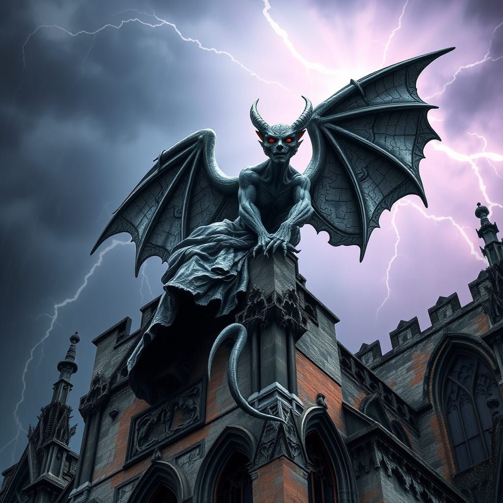 This haunting image depicts a majestic, intricately carved gothic female gargoyle perched atop a crumbling cathedral, bathed in the eerie glow of a stormy sky. Delicate carvings adorn her stone body, blending seamlessly into the worn architecture.