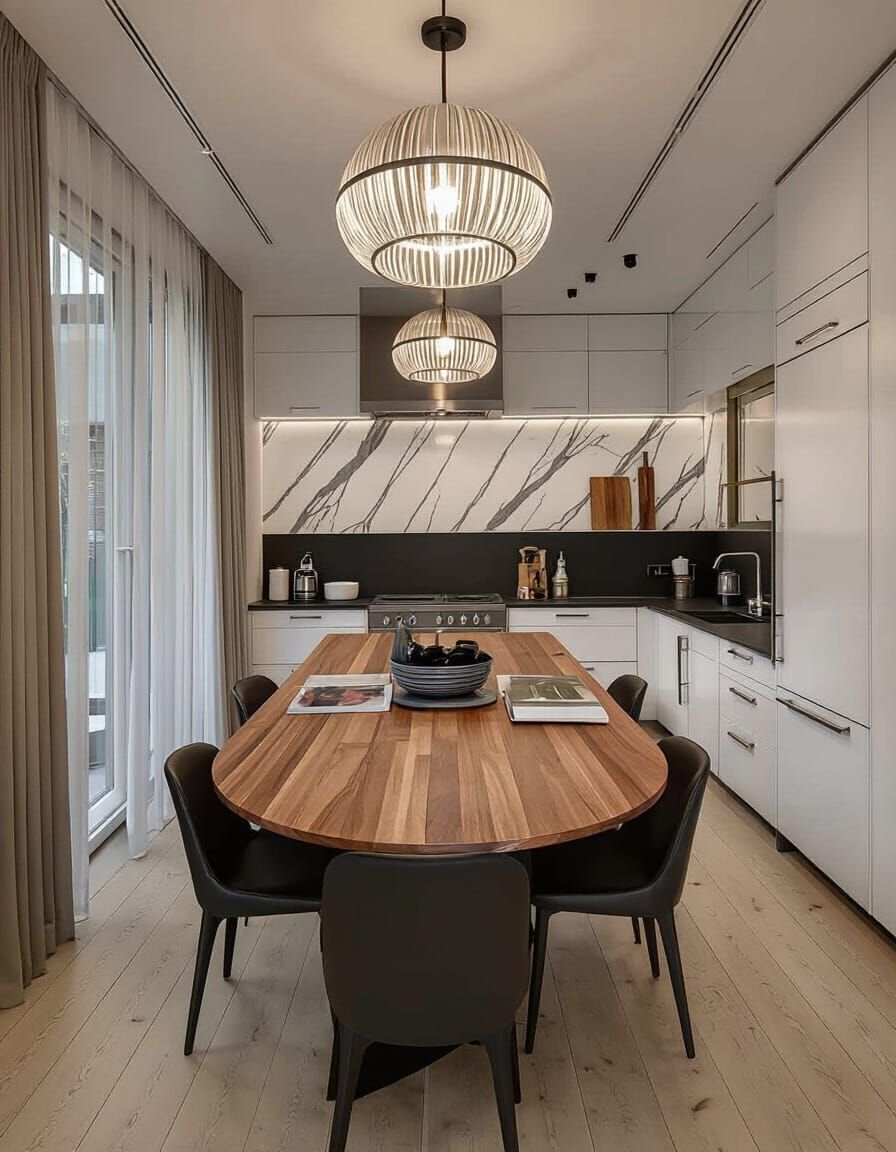 This image shows a minimalist kitchen with dark brown cabinets, cherry wood countertops, and a marble backsplash featuring gray veins. Accented by natural wood floors and vertical wood panels.