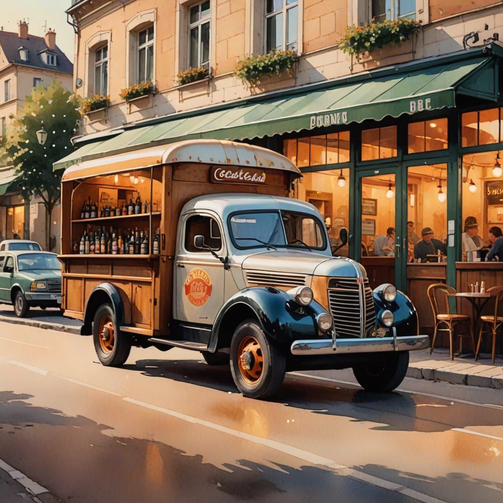 This image shows a nostalgic illustration of a vintage beer truck parked in a charming French cafe, bathed in warm golden hour lighting with soft focus and high detail.