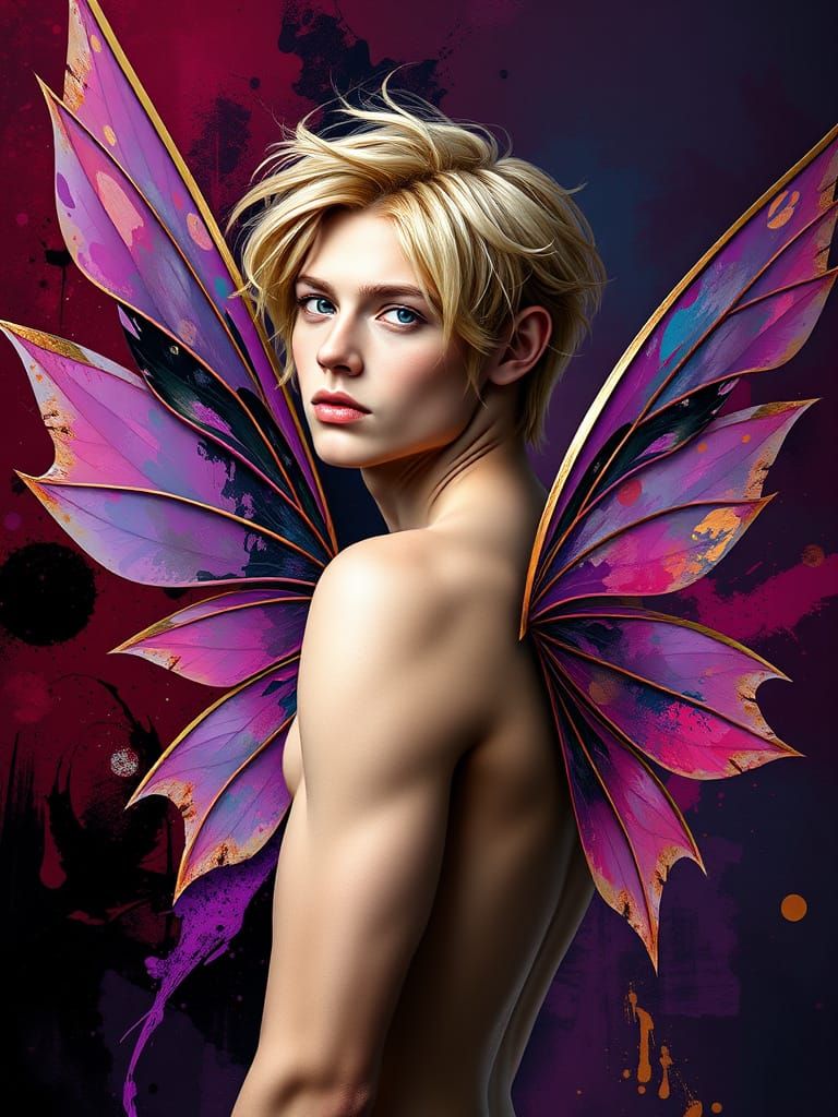 This striking portrait of a male fairy showcases delicate, petal-like wings and an enigmatic gaze, set against a dynamic, abstract background gradating through a rich triadic color palette. Blending Neo-Cubism and Art Deco elements, this concept art piece is reminiscent of Unreal Engine 5 and Artstation'...