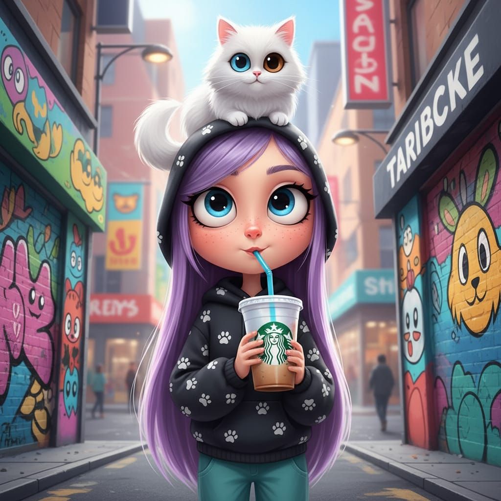 This image shows a stylized cartoon girl with purple hair and freckles holding a Starbucks cup, accompanied by a unique cat. Rendered in vibrant pastel tones with cinematic lighting, evoking a playful, caricature-like feel.