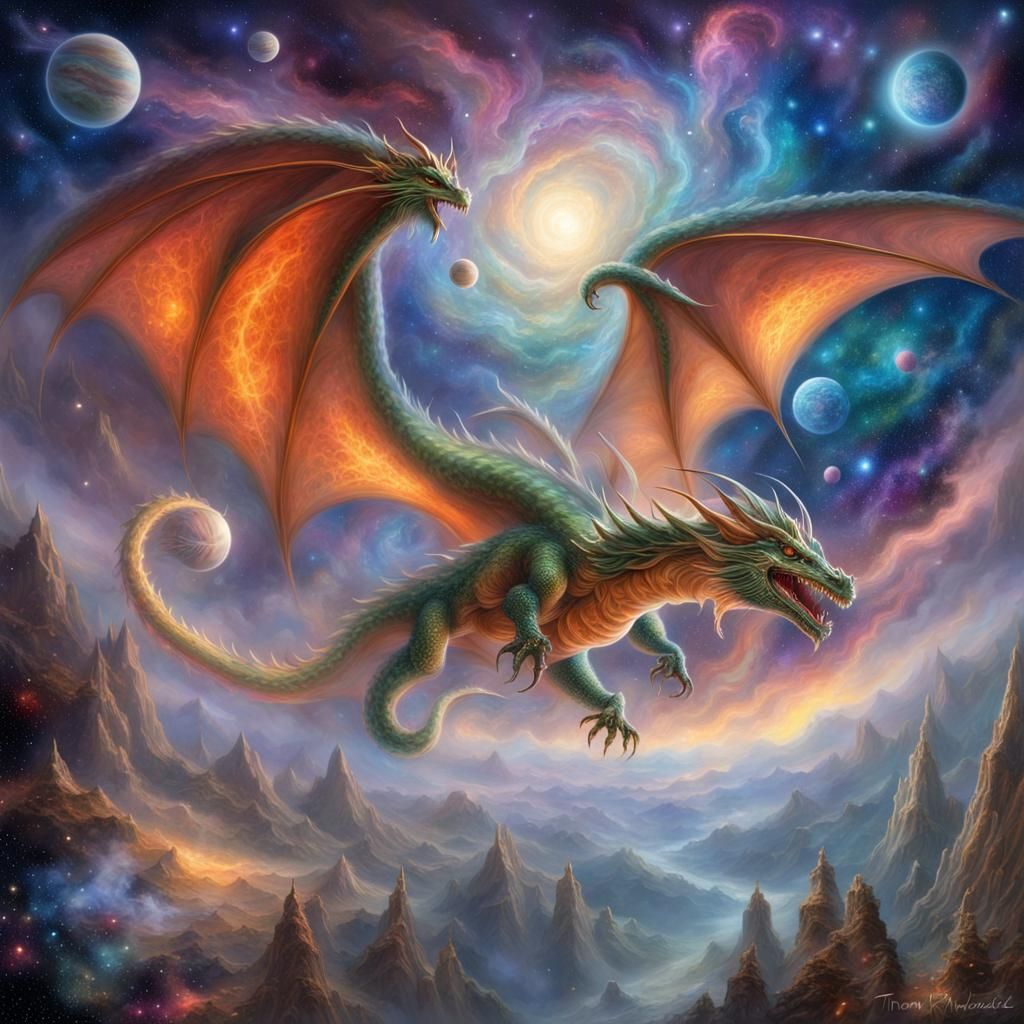 This image shows a galactic dragon soaring through the cosmos amidst planets and stars. The highly detailed, colorful, ethereal fantasy art style evokes a sense of wonder.