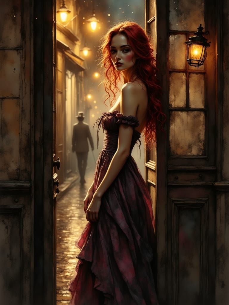 A striking portrait of a red-haired Victorian woman in a worn dress, waiting in a lit doorway on a misty, rain-slicked street. Rendered with cinematic lighting and gritty textures.