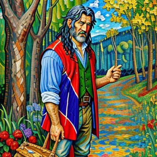 This image shows a rustic mosaic patchwork inspired by Lord of the Rings. The vibrant and colourful image is rendered in a neo-impressionist style with thick layers of textured paint.
