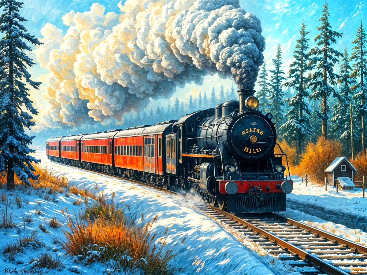 A striking impressionist oil painting of a steam train journeying through a snowy forest. This artwork features vivid colors and thick, textured brushstrokes, evoking nostalgia and wonder.