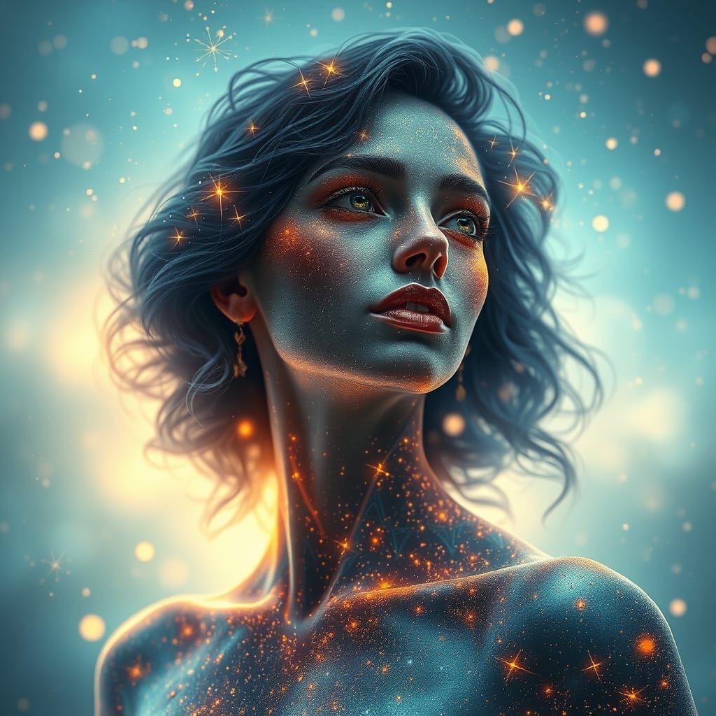 A striking picture of a celestial woman made of stardust. The portrait features dynamic lighting and intricate, hyperdetailed patterns in cobalt, amber, and mint green, rendered as 8k resolution concept art.