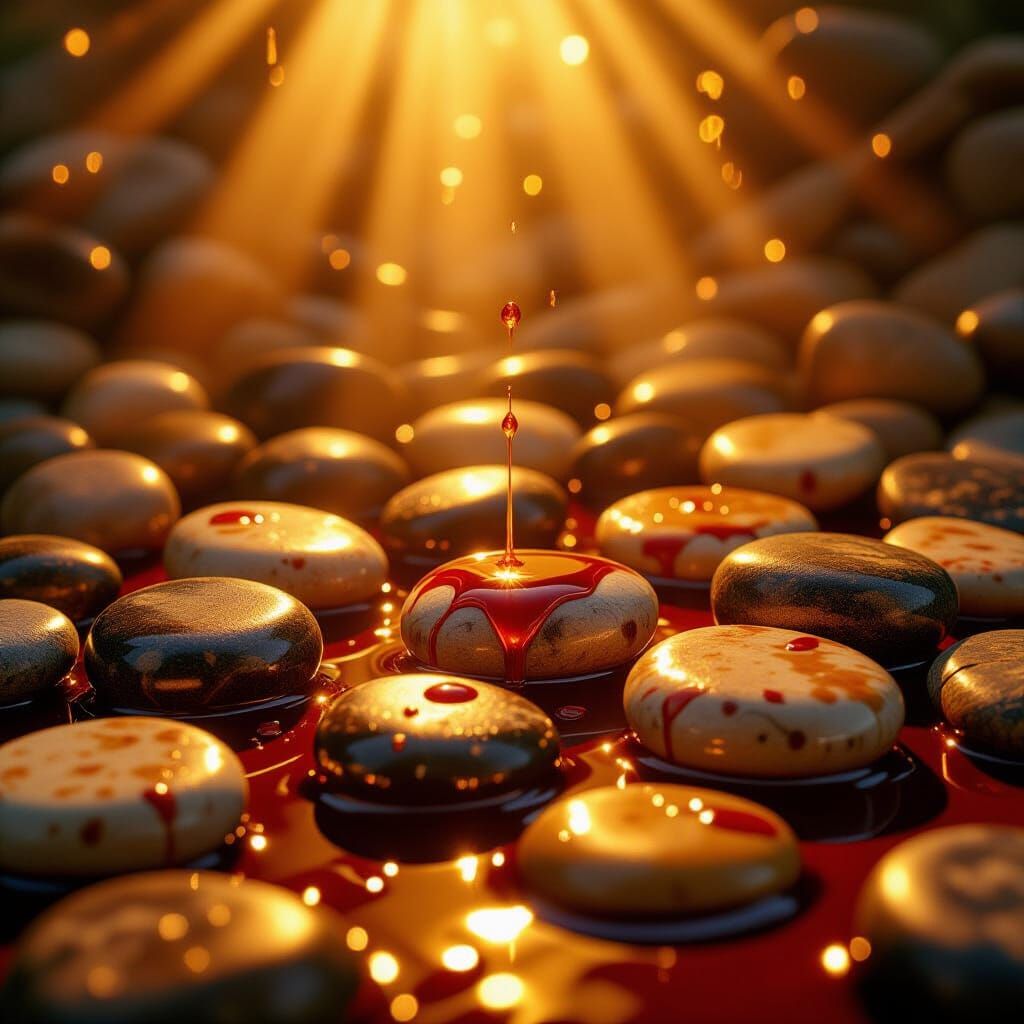 A striking picture of stones covered in blood and honey, illuminated by warm light. The image has a cinematic aesthetic with film grain, dramatic lighting and rich colors, as a matte painting.