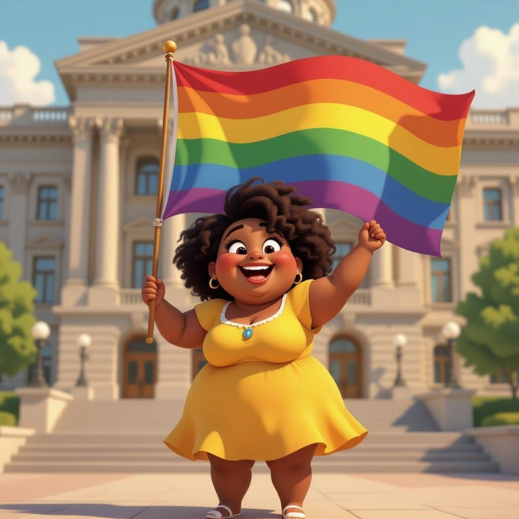 This image shows a happy, plus-sized Black girl with a Pride flag in front of City Hall. Her gleeful expression radiates warmth in this stylized animation.