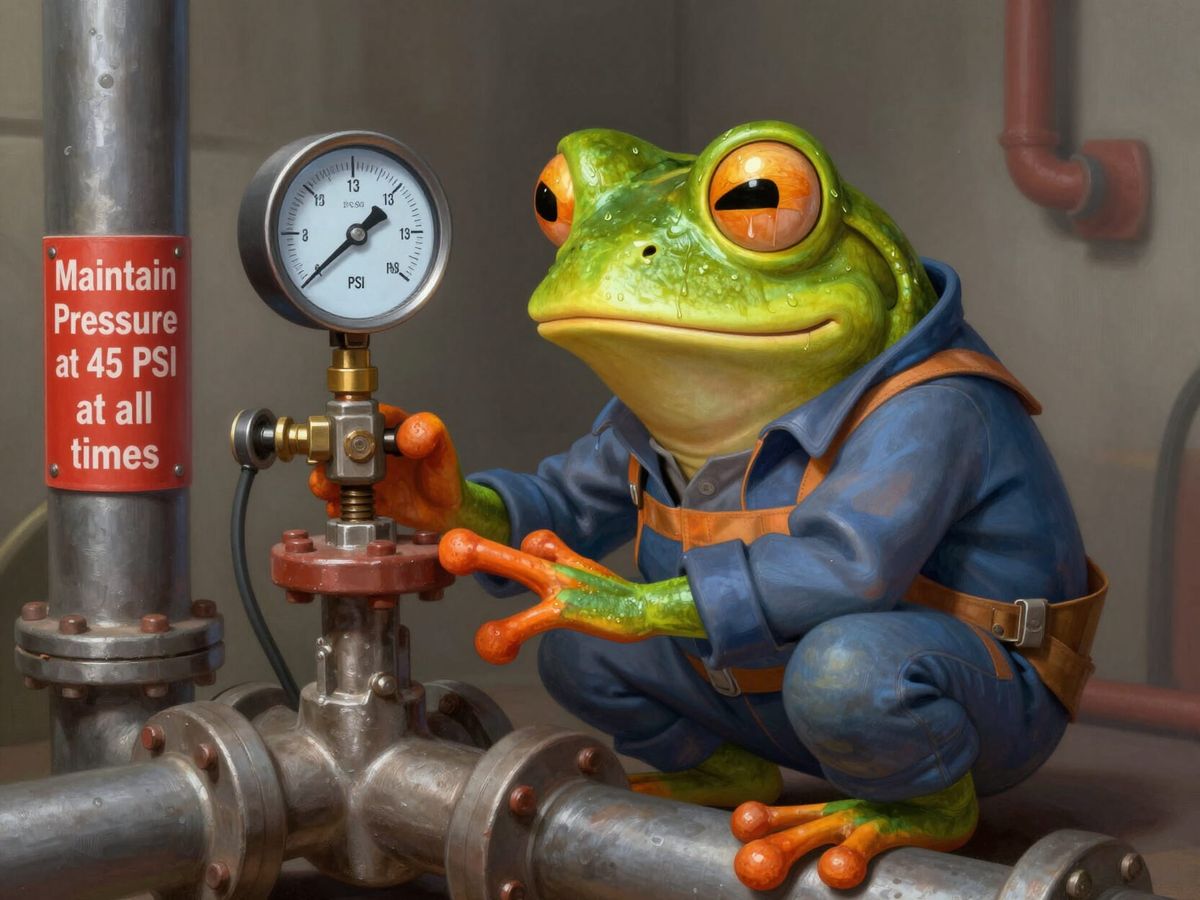 This image shows a concerned frog engineer in PPE struggling with a pressure valve that is dangerously under-pressurized, depicted in a vibrant digital painting style with dramatic lighting.