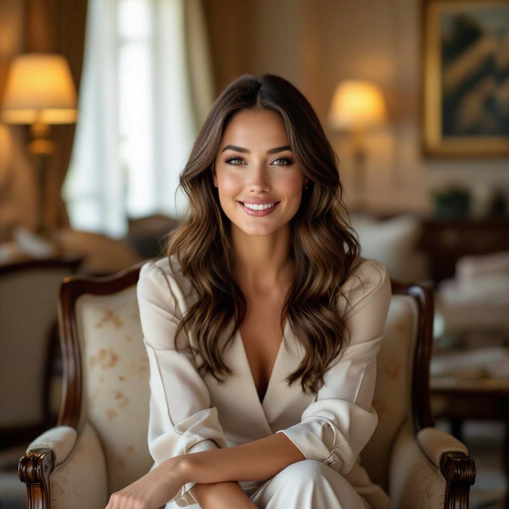 This image shows a beautiful 23-year-old woman sitting in a hotel living room. The elegant decor and golden cinematic lighting create a refined, naturalistic scene with a shallow depth of field.
