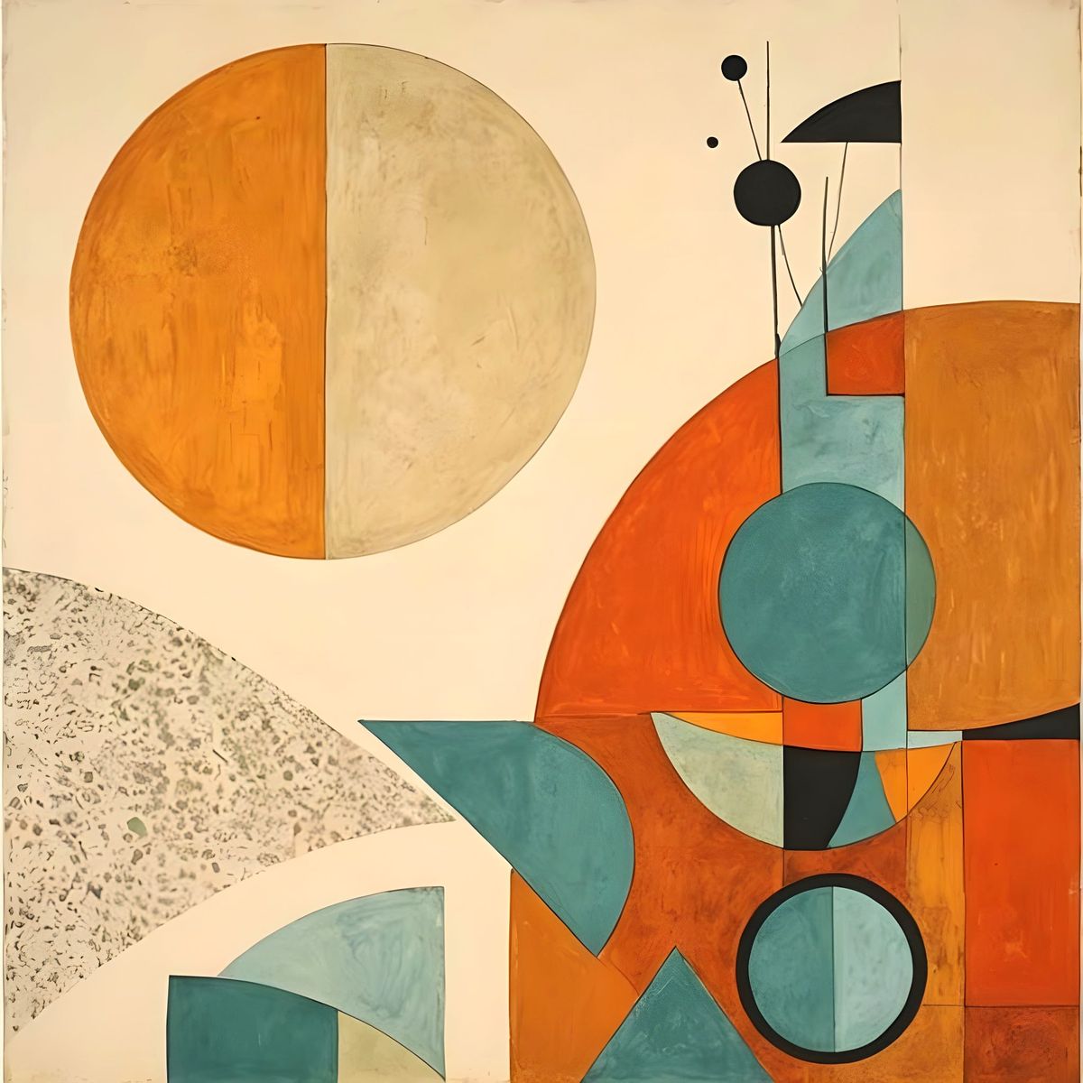 This image shows a minimalist abstract landscape painting featuring ovals and tessellated checkerboard patterns. The artwork evokes a mid-century modern aesthetic.