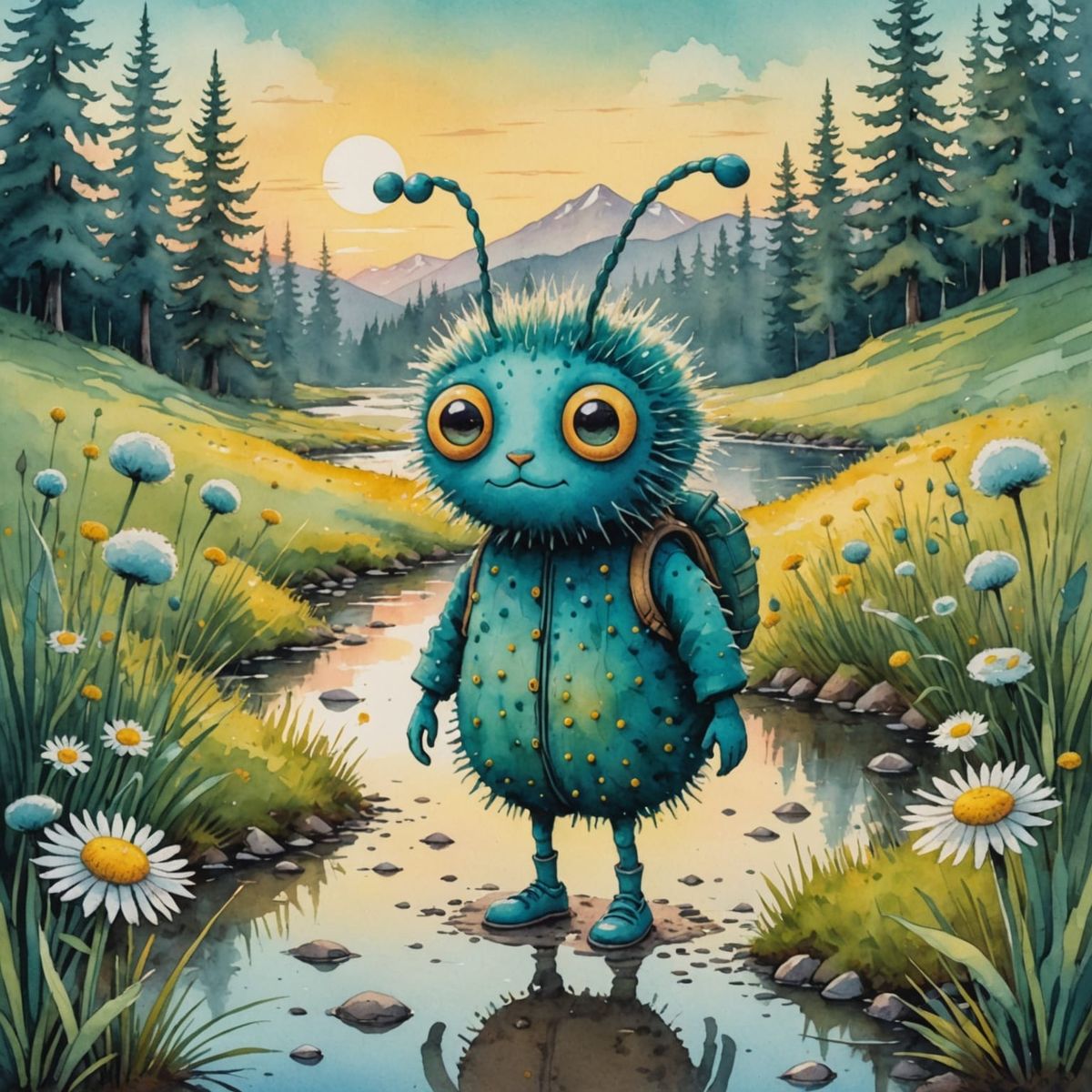 A charming anthropomorphic creature with fluffy hair and furry legs walks beside a creek at sunrise. Rendered in a soft, watercolor sponge-blotter style with FabergΓ©-like delicacy.