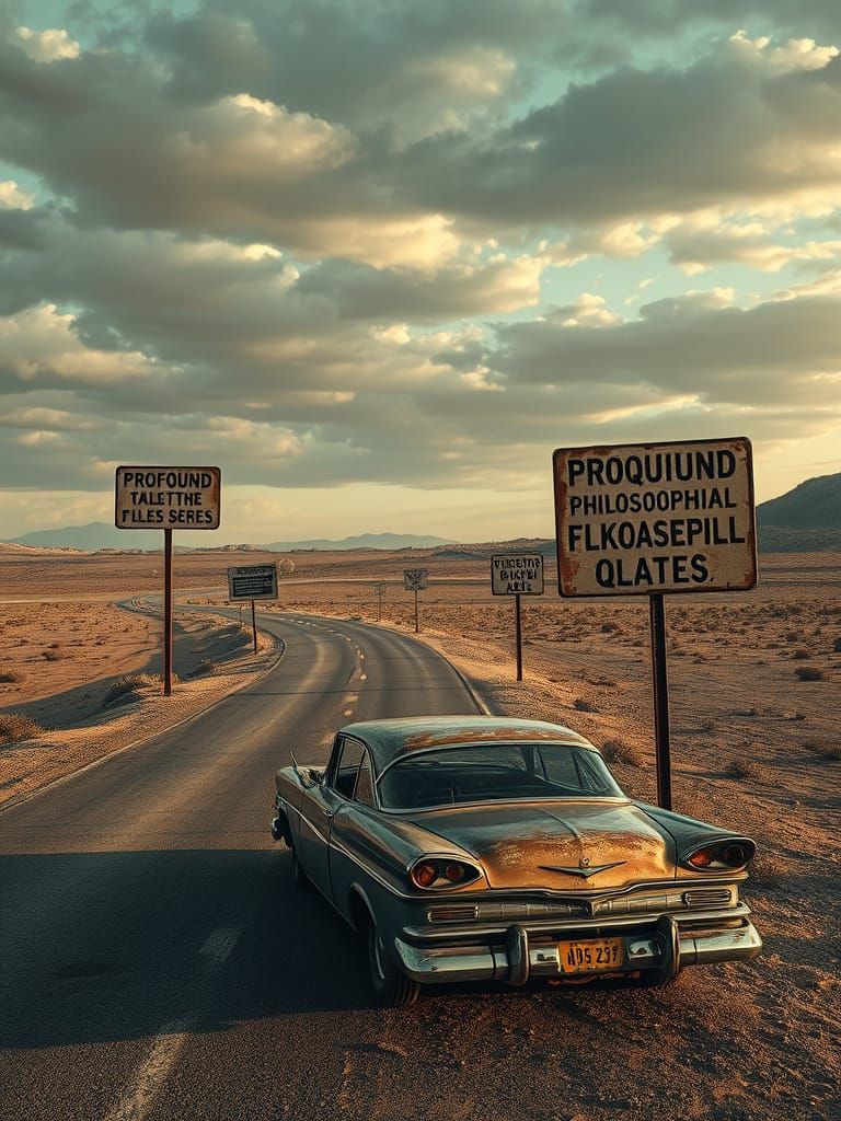 A haunting desert landscape with a winding road lined with retro-style signs bearing profound philosophical quotes in Gothic font, an abandoned vintage car, and ominous demonic silhouettes in the clouds, evoking a sense of foreboding and unease.