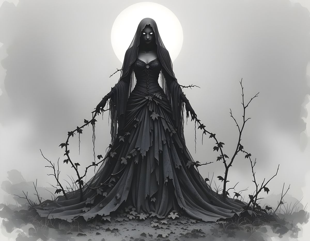 Dark fantasy art. Full shot. A spectral bride formed of thorny vines and decaying leaves rises from overgrown soil, eyes glowing eerily. Pale moonlight casts long shadows. Inspired by ZdzisΕaw BeksiΕski and Gustave DorΓ©. Emotional surrealism, forgotten beauty, smudged charcoal, sketchbook demon, dramatic lighting. A masterpiece, best quality, 8k resolution.