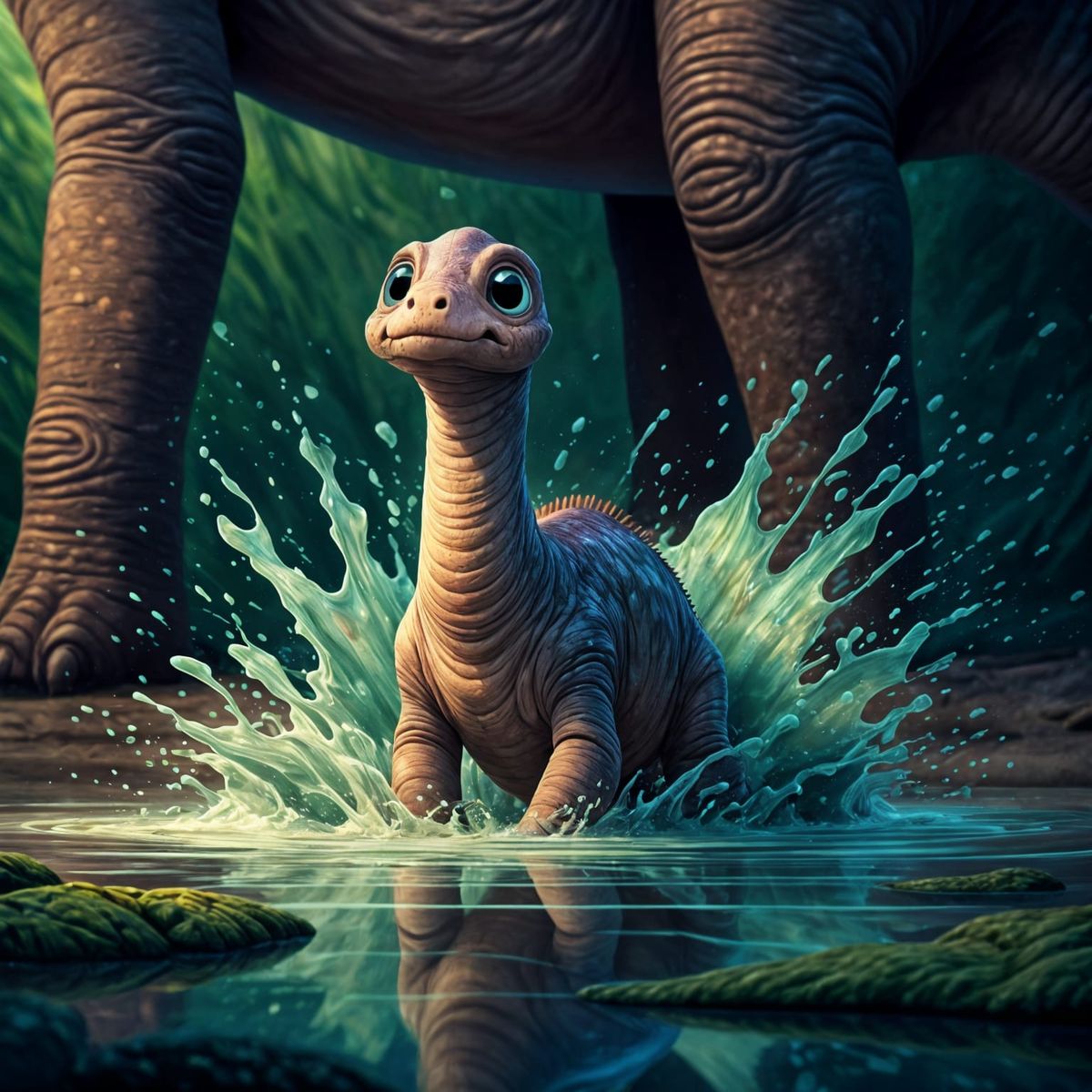 A charming image of a baby diplodocus gleefully splashing in a puddle, its mother nearby. The vibrant, iridescent dinosaur has big expressive eyes and a playful demeanor.