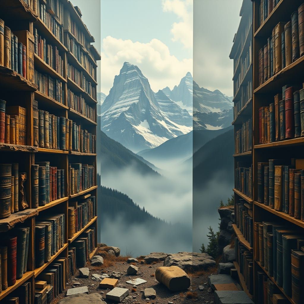 This surreal image blends towering bookshelves and aged books with majestic mountain peaks. It features dreamlike, overlapping panels with cinematic lighting in blues, browns, and whites, evoking fine art surrealism.
