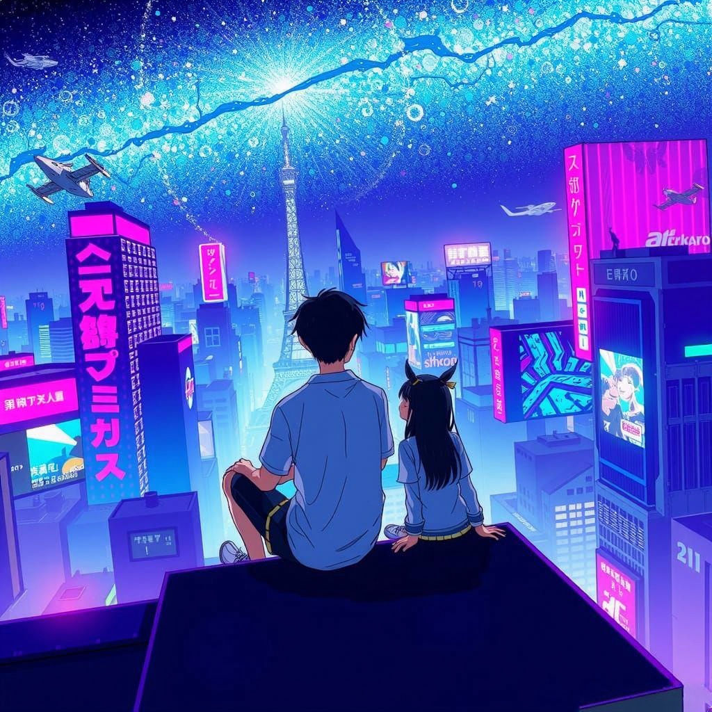 "An anime couple, a young man and woman, are sitting on a rooftop overlooking a sprawling cyberpunk city at night, gazing at the stars in the sky. The city is filled with neon lights, holographic billboards, and flying vehicles. The style is inspired by the works of Katsuhiro Otomo and Masamune Shirow, with a touch of romanticism and a dreamy, ethereal quality. The colors are vibrant and saturated, with a focus on blues, purples, and pinks."