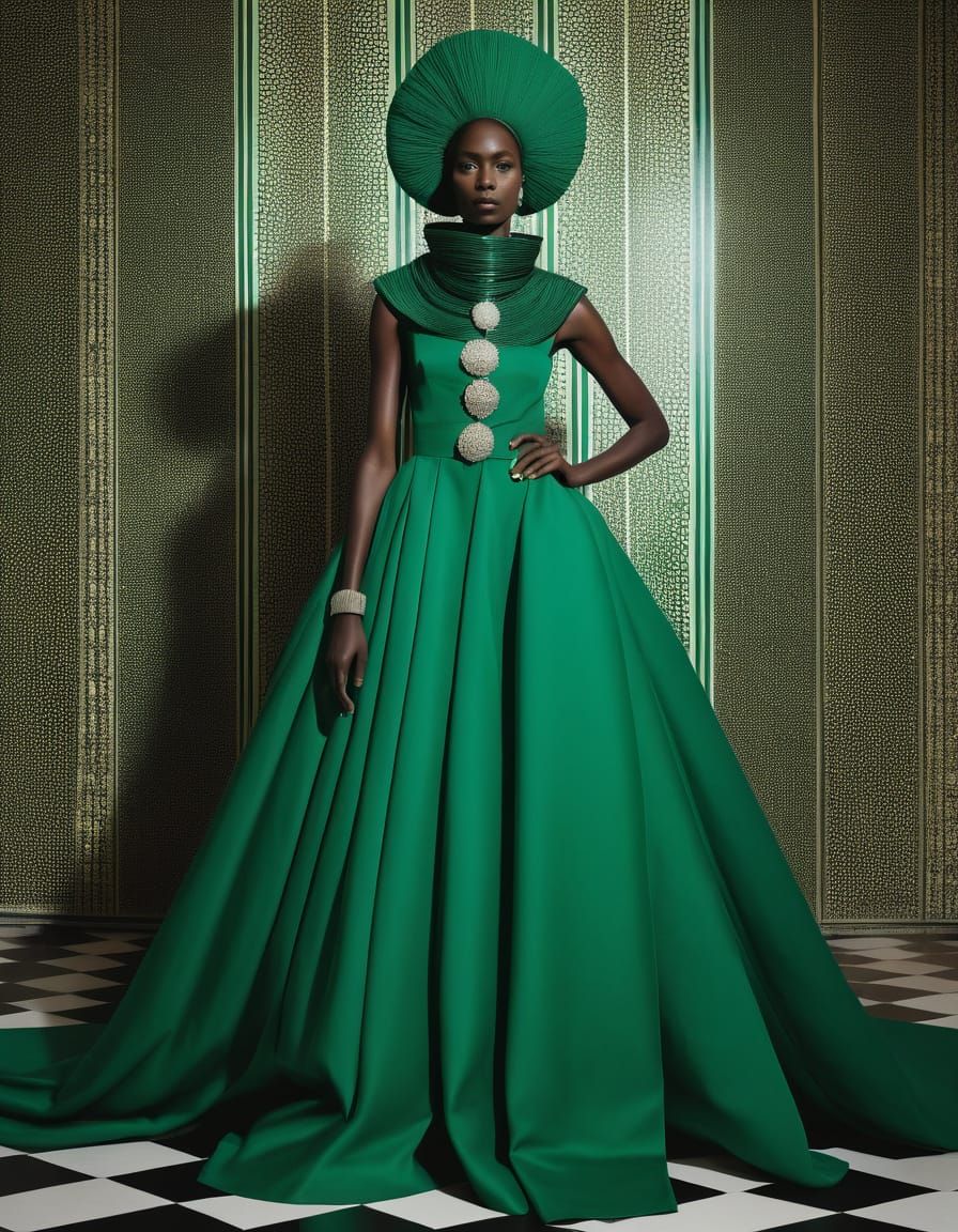 This image depicts a striking portrait of an African bride in a vibrant malachite dress, created in a bold and vintage style with op art influences.