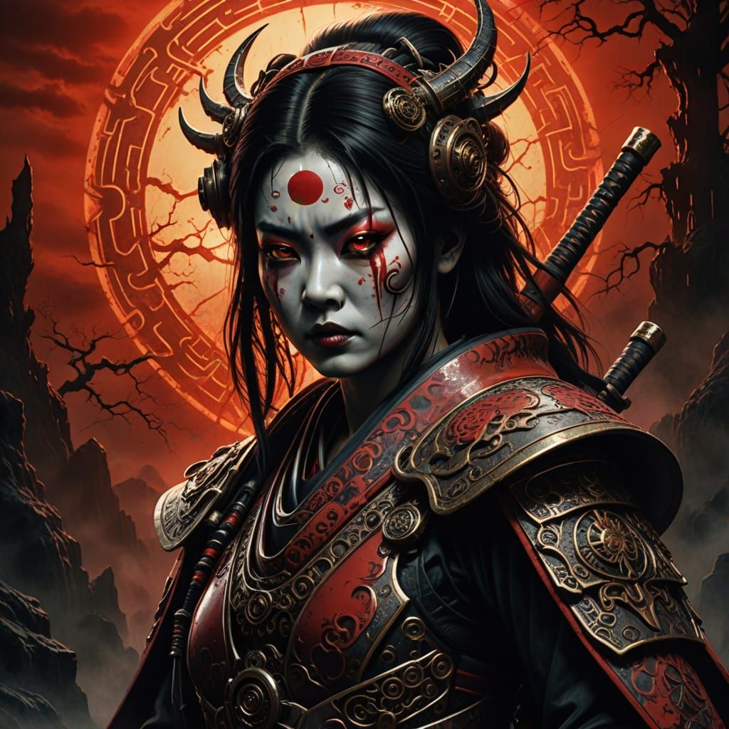 This image shows a mysterious geisha in samurai armor with intricate tattoos and a striking red and gold kimono, set against a dark, eerie backdrop with a glowing red sun and misty atmosphere, inspired by traditional Japanese art and dark fantasy.