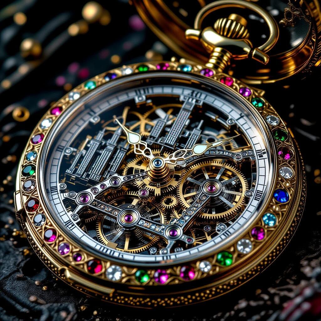This image shows a hyper-detailed view into a broken Victorian pocket watch. Inside, a miniature city thrives among jeweled gears and brass filigree, blending industrial and sci-fi elements.